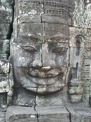 Back to temples... Determining whether or not a temple is Hindu or Buddhist can get a little confusing in Cambodia. In ancient Cambodia religion was dictated by the head of state, so anytime there was a new leader there could potentially be a new religion. However, Bayon Temple, our next stop after Angkor Wat, is distinctly Buddhist. There are 216 different giant Buddha heads looking at you as you wander around the temple. There are also full-bodied Buddhist statues all over the place, many of them headless and defaced as a result of thieves. If you check out the museum in Siem Reap, it is full of Buddha heads that have been recovered from all over the world. In addition to the Buddha heads and statues, there are also several places you can make an offering to Buddha, always apparent by the strong smell of incense and the colored scarves placed around Buddha's shoulders. People usually leave money, both real and fake, and sometimes they leave a soda or some fruit for Buddha to eat.